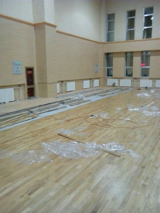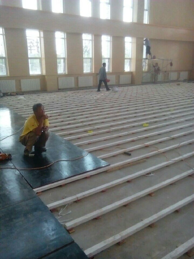 此次籃球木地板鋪裝面積為534平方米,采用柞木A級(jí),單龍骨結(jié)構(gòu)系統(tǒng)。